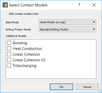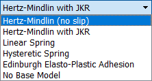 Additional models such as bonding, heat conduction, wear, cohesion (if it is not included in the base model) and electrostatics can be included in addition to the Base and Rolling Friction models.