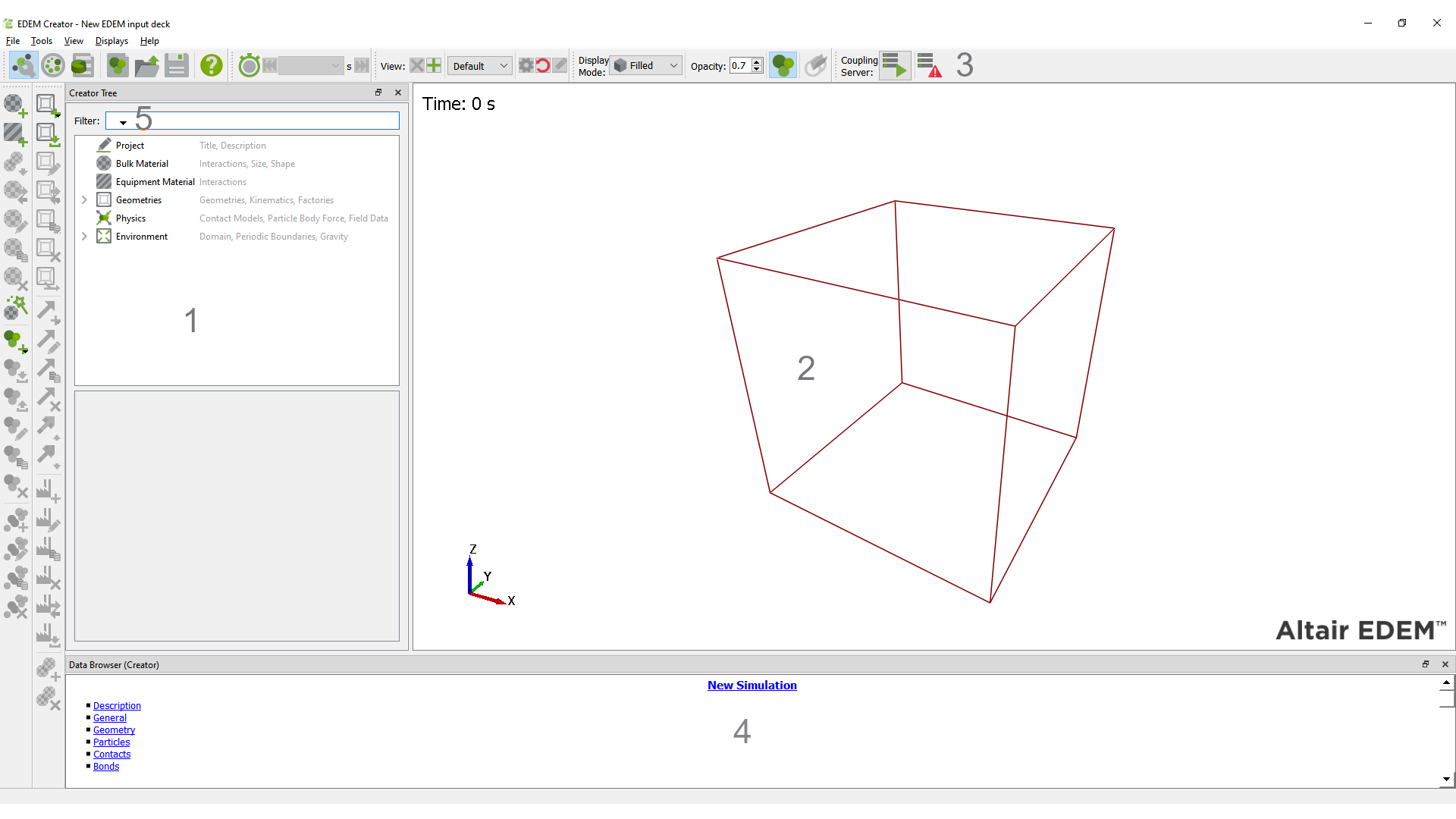 The Creator Tree is displayed on the left side of the EDEM window. This allows you to input Bulk Materials, Equipment Materials and set the simulation Environment. The tree is driven by the icons and a ‘right click’ menu system. A similar Tree system is used in the EDEM Analyst.