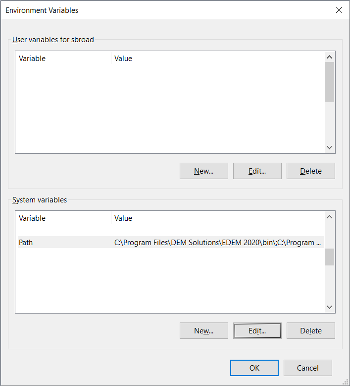 The path to the EDEM installation folder must be defined manually.  This is done using the environment variables.  If EDEM is installed to the default location the EDEM executable (edem.exe) is in the folder: