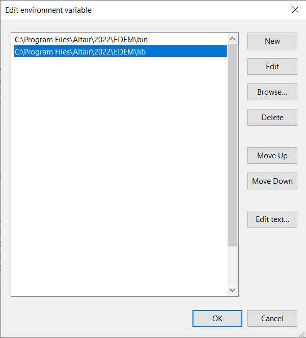 7. Repeat this for the location of the lib folder (default: C:\Program Files\Altair\2022\EDEM\lib)