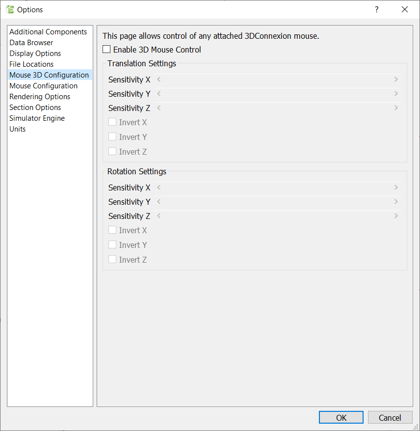 The 6 degrees-of-freedom input on the SpaceMouse devices require no special configuration prior to using it within EDEM, however the Mouse 3D Configuration control panel may be used to adjust the sensitivity of the device, as well as how the axes respond to input.