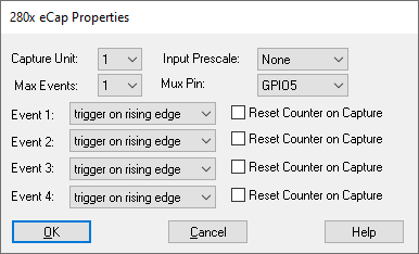 You can choose the maximum number of events to track. To track both the on time and off time of a PWM signal, set Max Events to 2, Event 1 to Trigger on Falling Edge, and Event 2 to Trigger on Rising Edge. Then activate the corresponding Reset Counter on Capture. With this setup, event pin 1 will produce PWM on time, and event 2 pin will produce PWM off time.