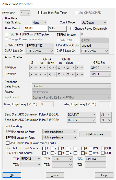 Description: The ePWM block lets you configure the enhanced PWM unit. The dynamic phase input operates on the current scaled period.