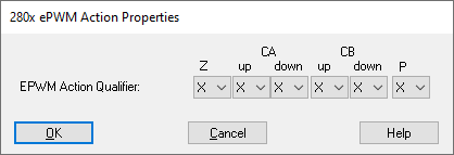 Description: The ePWM Action block lets you configure the action qualifier for the F280X. This lets you control the PWM waveform.