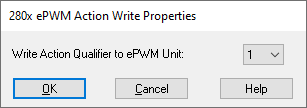 Description: The ePWM Action Write block lets you set the action qualifier for the ePWM unit by writing the input values to the appropriate hardware registers. The appropriate values come from the ePWM Action block.