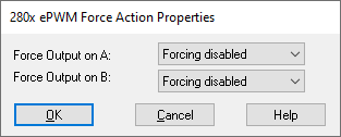 Description: The ePWM Force Action block lets you force an output for the ePWM units. This is useful for applications like BLDC motor commutation.