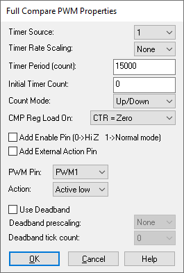 Description: The Full Compare PWM block lets you set up a full compare PWM unit. You can choose to specify the action at initialization and it will not change during execution.