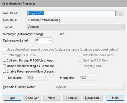 Result File: Indicates the C file to be created. By default, the name of the file is the name of the open block diagram. When you press Compile, Embed automatically creates the C file, then compiles and links it to create an OUT or ELF file. You can alternatively press Code Gen to create only a C file. You can open and browse the C file by clicking on Browse.