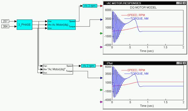 For example, in following diagram, a DLL is created from the AC Motor (dq) compound block. To verify that the DLL operates correctly, the inputs to the compound block are fed into the DLL. A second plot block, with the same properties as the original plot is placed in the diagram. If both plots register the same results when you simulate the diagram, then the DLL is correct.
