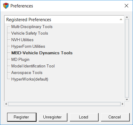 To build a leaf spring model, you must first load the MBD-Vehicle Dynamics Tools preference file in MotionView. Once loaded, HyperWorks remembers and automatically loads the MBD-Vehicle Dynamics Tools preference file each time you start HyperWorks.
