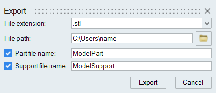 エクスポート 3Dプリント対象に準備したパートとサポートを含むファイルをエクスポートします。 前提条件:ファイルをエクスポートして3Dプリンターに送信する前に、パートの準備、向き合わせ、サポートを行います。 エクスポート アイコンをクリックします。 目的のファイルパスと拡張子を選択します。パートとサポートは別々のファイルに保存されるため、エクスポートするファイルを選択できます。 エクスポートをクリックします。