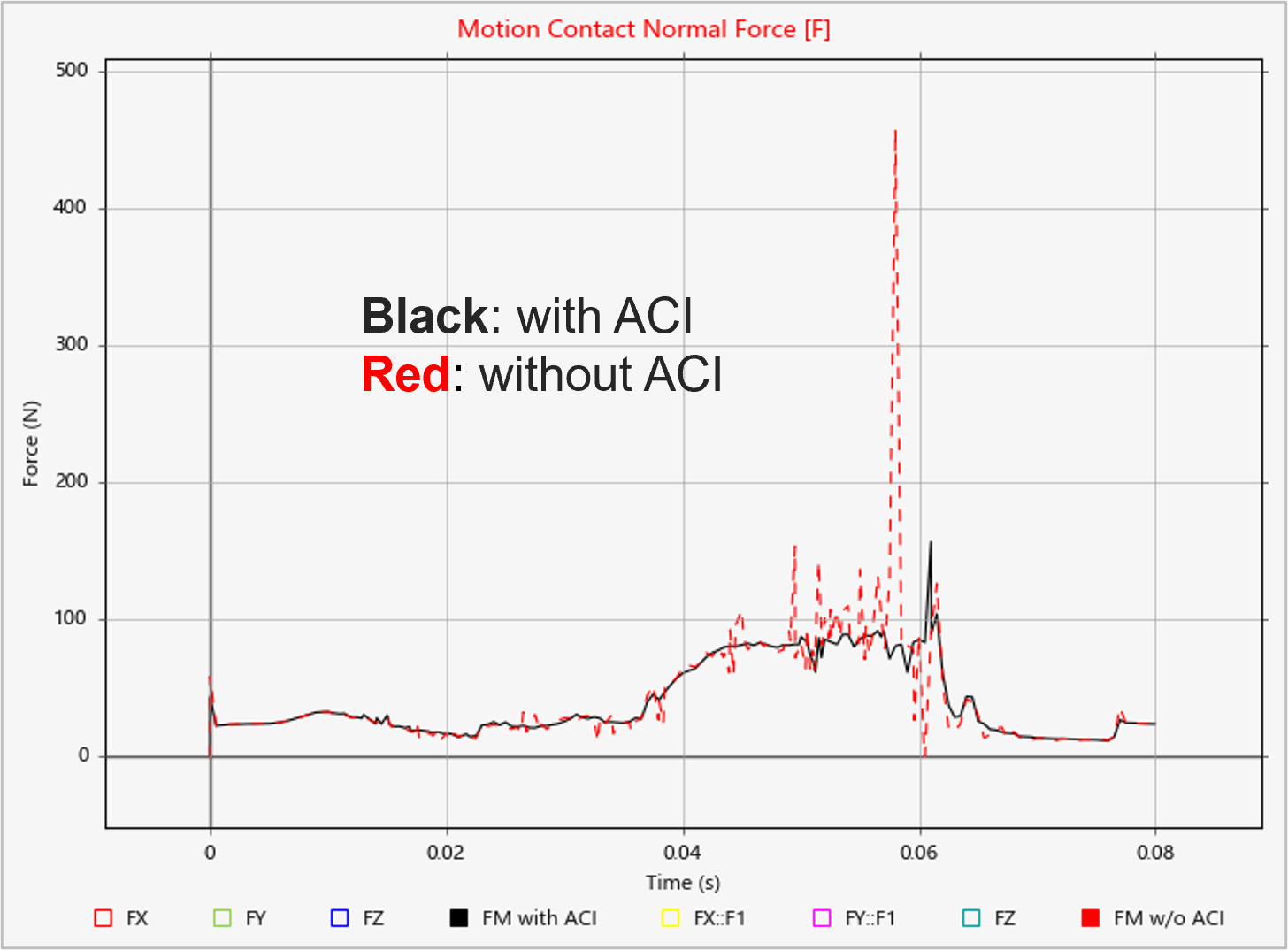 注: 接触力結果保存のグローバル設定を上書きしてモーション接触を個別に処理する場合はプロパティエディターから実行できます。 - ACI(Active Contact Iteration):パート間の接触を伴う特定のモデルでは、解の偏導関数のマトリックス(ヤコビアンマトリックス)の更新頻度に荷重の結果の品質が依存することがあります。タイムステップが大きいモデルや、接触減衰に対して接触剛性が高いモデルでは、接触荷重にノイズが生じることがあります。