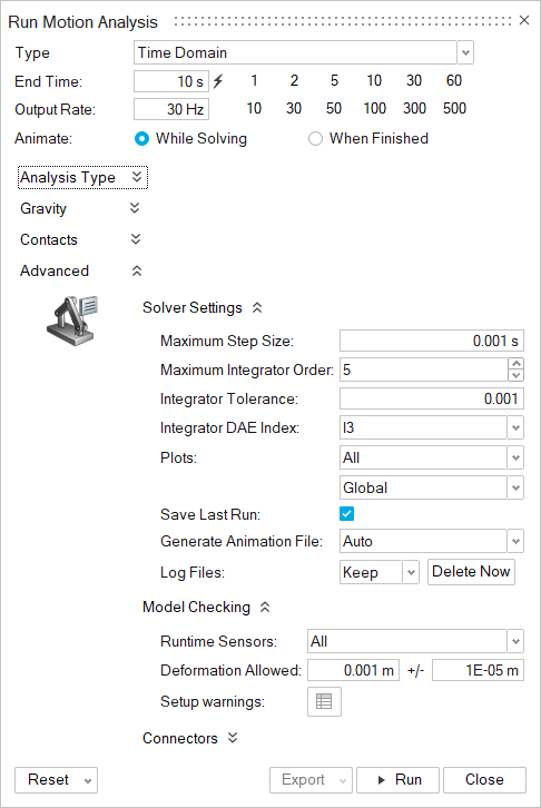 モーションシミュレーションの実行時間、結果出力のフレーム数、解析のタイプ、重力を考慮するかどうかを制御できます。
