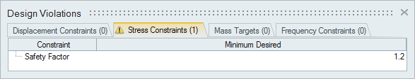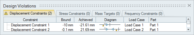 境界は、変位制約に当初から定義されている上限と下限を示します。達成は、所定の制約と荷重ケースに対して実際に得られた変位量を示します。パートには、変位制約が適用されたパートの名前が表示されます。