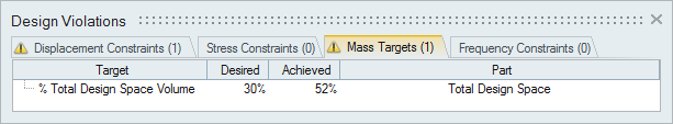 目標は最適化の実行で選択した目標質量のタイプを示し、値は目標値を示します。達成は、指定したパートに対して実際に得られた質量を示します。設計領域ごとに目標質量を指定している場合は、パート列に各パート名が表示されます。