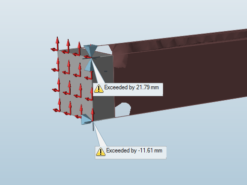 上限と下限の両方を持つ変位制約の場合、ダイアグラムは、変位制約が正または負の方向に違反したかどうかを示します。古いモデルではダイアグラムを使用できないことがあります。その場合は不明と表示されます。