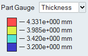 板厚最適化の場合は、形状比較では、各パートの板厚を示す色分けされた凡例が表示されます。プルダウンメニューを使用して、各パートの板厚の変化率を表示するように凡例を変更することもできます。