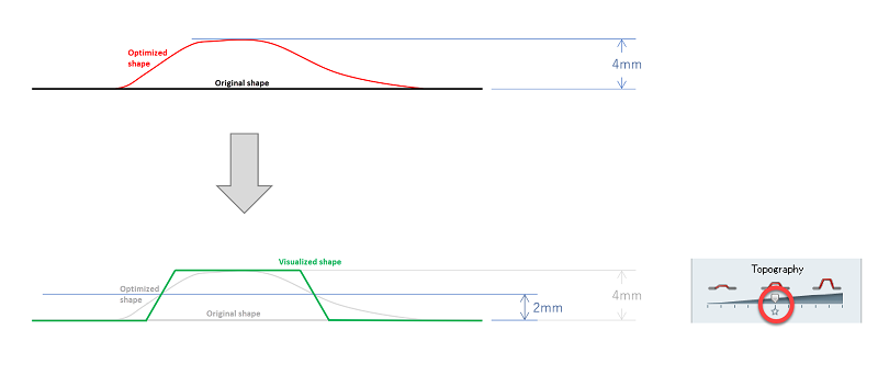 トポグラフィー最適化の場合は、スライダーを左右に動かすと、結果には、パートのどの部分を修正する必要があるのかが示されます。パートの2つの位置(元の位置と全ビード高)のみが表示されます。スライダーはビードが全高に移動される高さを示します。例えば、ビードの全高が4mmであり、高さが2mmになった領域が結果に含まれている場合、スライダーの位置が中央にあるときは、これらの高さ2mm以上の領域は全高4mmで表示されます。高さが2mm未満の領域は、元の高さで表示されます。これにより、通常より簡単に結果を可視化してCAD形状に変換できるようになります。