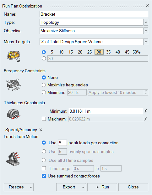 파트 최적화 실행 도구를 사용하여 모션 파트에서 토폴로지, 토포그라피 및/또는 게이지 최적화를 정의하고 실행합니다.