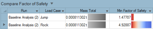 해석 실행 창에서 추가 결과 유형 및 매개변수를 표시하도록 열을 추가할 수 있습니다. 빨간색-파란색 색상 밴드는 해석 결과 탐색기에 있는 범례와 일치합니다. 밴드의 폭은 결과의 크기를 나타냅니다. 해석 결과 탐색기에서 상한값과 하한값을 변경하면 해석 결과 비교 표에 자동으로 반영됩니다.