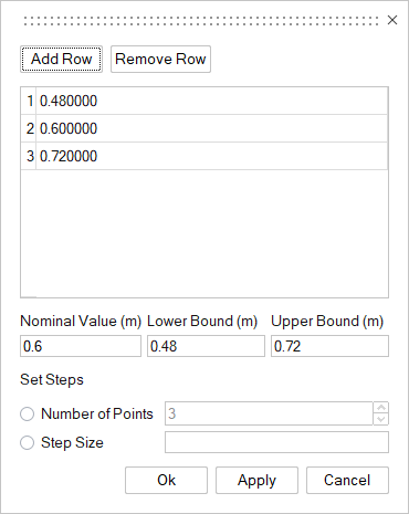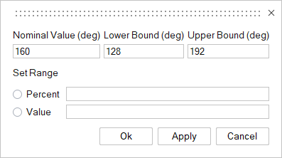- 범위 설정: 퍼센트또는 값 차이로서 연속 변수에 대한 공칭 값의 상한값과 하한값 차이를 기준으로 최소값과 최대값 사이의 범위를 설정합니다. 기본적으로 범위는 공칭 값의 +/- 10%입니다.