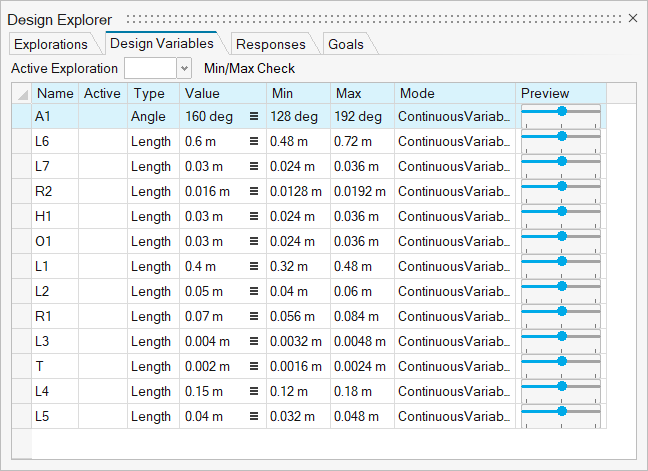 변수 관리자의 모든 변수는 변수 관리자의 다른 변수에 연결된 경우를 제외하고는 자동으로 디자인 변수 관리자에 추가됩니다. 디자인 변수 관리자에서 명목값, 학습할 변수 범위의 최소값 및 최대값, 모드(연속 또는 불연속)를 설정할 수 있습니다.