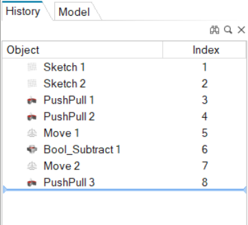 모델에서 지오메트리를 생성, 수정, 이동 또는 삭제하거나 모델 브라우저에서 파트를 그룹화하면 Inspire는 모델의 컨스트럭션 이력에 작업을 기록합니다.
