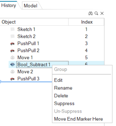 이 옵션은 끝 표식(파란색 선)을 선택된 컨스트럭션 피처로 이동합니다. 나중에 컨스트럭션 피처가 내역 브라우저에서 회색으로 표시되고 모델링 창에는 나타나지 않습니다. 끝 표식을 선택하고 컨스트럭션 이력에서 원하는 지점으로 끌 수도 있습니다.