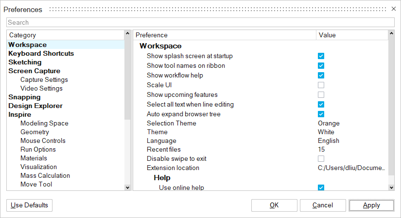 작업공간 표시, 기본 키보드 단축키 및 기타 설정을 수정합니다.