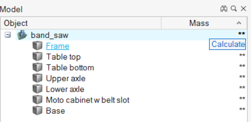 질량 계산 질량 계산을 사용하면 질량을 계산해서 모델 브라우저에 표시할 수 있습니다. 전체 성능을 향상시키기 위해, CAD 파일을 가져올 때 질량 크기는 계산되지 않고 모델 브라우저에서 **로 표시됩니다. 모델 탐색기에서 질량을 표시하려면 모델 탐색기에서 열 제목을 마우스 오른쪽 버튼으로 클릭합니다. 속성에서 질량 확인란을 선택합니다. 확인을 클릭합니다. 계산 버튼을 클릭해서 파트의 질량을 표시합니다. 0이 아닌 질량은 고체를 나타냅니다. 주: 속성 편집기에서 선택한 파트의 질량을 재정의할 수 있습니다. 이것은 측정 중량 계산 및 모션 계산에 영향을 주지만 구조 해석 계산에는 영향을 주지 않습니다.