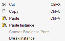 파트와 인스턴스 간의 연결을 끊으려면, 인스턴스된 파트를 마우스 오른쪽 버튼으로 클릭하고 컨텍스트 메뉴에서 인스턴스 끊기를 선택합니다. 모든 인스턴스를 끊으려면, [인스턴스 끊기]를 선택하기 전에 모든 인스턴스된 파트를 상자 선택하십시오. 선택한 파트가 어셈블리에 속한 경우, [인스턴스 끊기]를 선택하면 선택한 파트가 있는 원래 어셈블리와 인스턴스된 어셈블리 사이의 연결이 끊어집니다. 조인트, 강체 그룹 또는 기타 커넥션을 생성하기 전에 인스턴스를 끊는 것이 가장 좋습니다. 그렇게 하지 않으면 삭제될 수 있습니다.