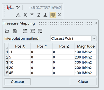 选择“非均匀压力”选项将打开“压力映射”表,您可以在其中输入压力数据的位置和大小。您也可以导入 .csv 格式的数据。