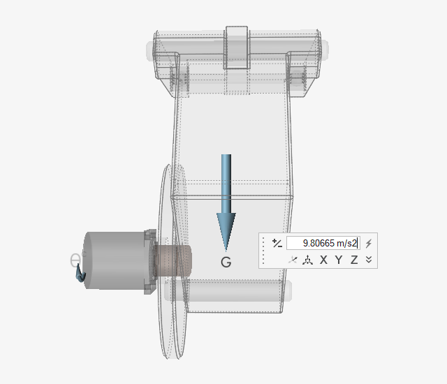 调整重力向量的方向,方法为:点击并拖动旋转器,或在小对话框中输入 15 deg,将向量向 Flywheel 倾斜,如图所示: