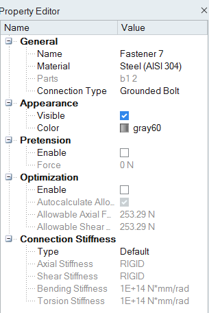 5. 选择其中一个接地螺栓(带螺母)并检验“属性编辑器”中的“连接刚度”字段。
