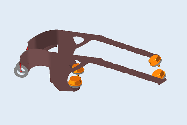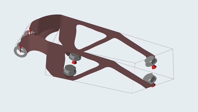 这是平动电机支架可用设计空间的一个曲面模型。注意:所有零件的指定厚度均为 2 mm,设计空间有一个对称平面,载荷已施加,并已使用接地螺栓(带螺母)对零件进行约束。