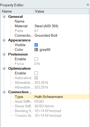 3. 在“属性编辑器”中,将连接刚度类型更改为 Huth-Schwarmann