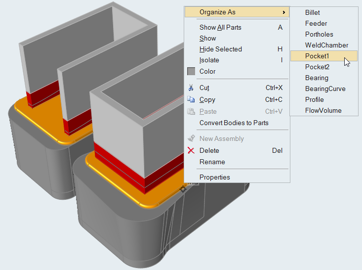 There are two ways of organizing solids. The first is to use the Organize Table feature. The second is to cut the flow volume manually and then assign the names.