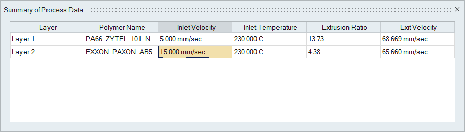 When extruding two or more polymers to create a coextruded part, the exit velocity and temperature conditions should be compatible. Exit velocities of all of the layers should be more or less the same. Temperatures of each layer need not be identical, as they have to be based on the material properties, but should coexist well. This tool will summarize the data to ensure it is compatible and will not affect the product quality and to help the user correct these issues if they arise.