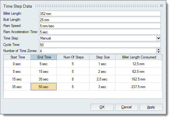 Use the Process Data tool to define the variable time step (VTS) data, billet taper, and heat transfer coefficient.