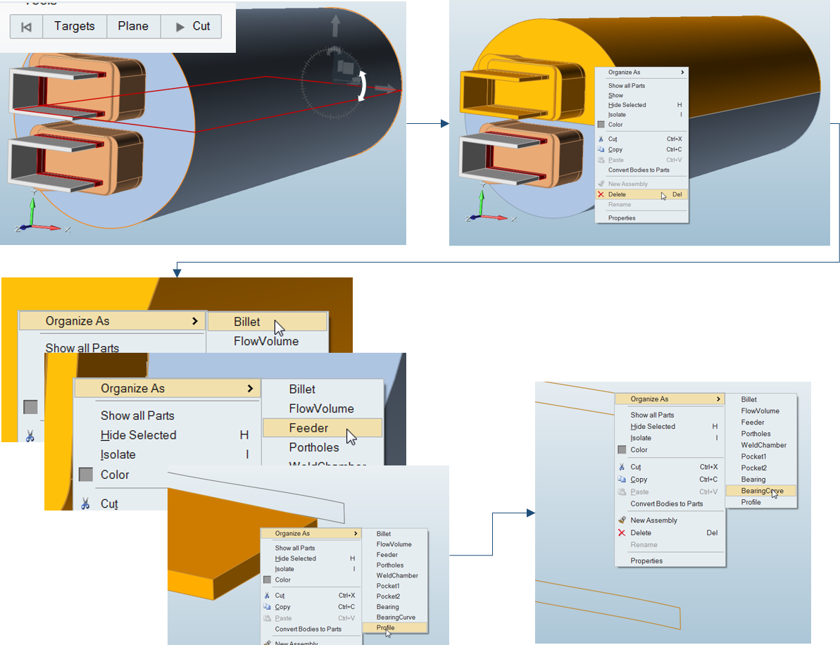 3. Reorganize solids as Billet, Feeder, Portholes, Pocket1 etc, as it was modeled.