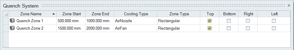 A dialog with the list of quench zones created is populated. You can enable or disable any side of the listed quench zones from the zone table.