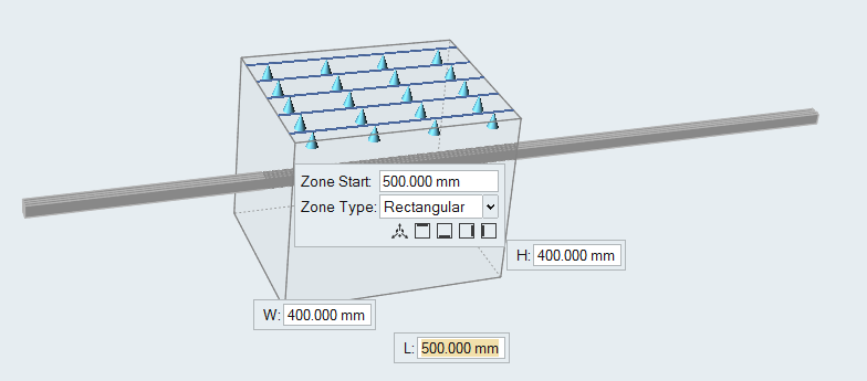 On Enter, the zone will be recreated based on the entered dimensions. Lines and nozzles are created based on the dimensions of the zones.