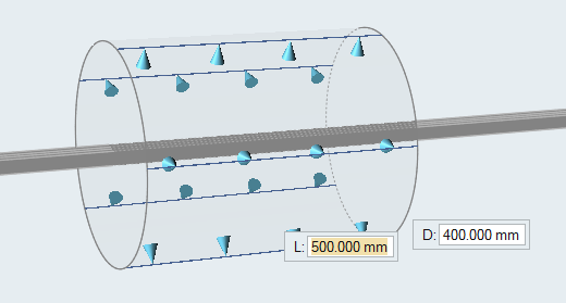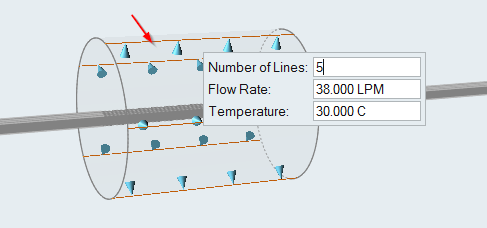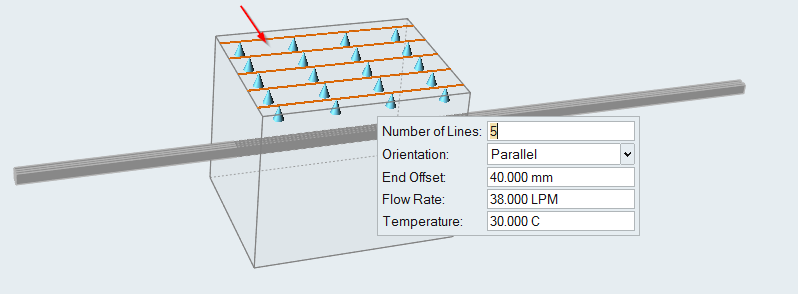 The flow rate specified is for the entire side, and is equally divided to each line. Lines are positioned at equal distances on the side, with the specified end offset (both ends). Temperature of the coolant is also specified in this dialog. Line orientation can be parallel or perpendicular. If it is parallel, then it will along the Z axis, otherwise it is perpendicular to the Z axis.