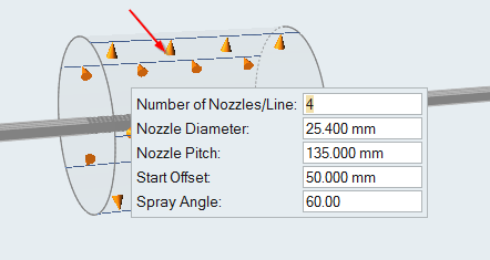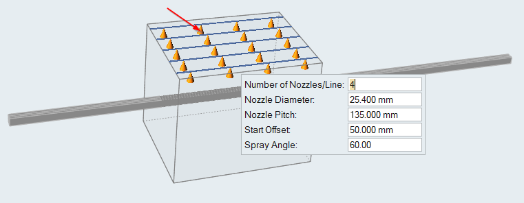 Each side of a rectangular quench zone can have a combination of line set and nozzle set, which can be enabled/disabled for a specific run. By default, top side is enabled. Each line set is made of set of lines, by default 5 lines and each line has a set of nozzles, by default 4 nozzles.