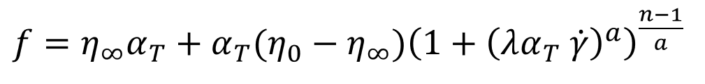 This model has a well defined upper (zero shear viscosity) and lower (infinite shear viscosity) limits for the polymer viscosity. Typically, the value of transition parameter is 2. Time constant lambda alters the nonlinear behavior of the fluid and its dependence on the shear rate. If the time constant is 0, then the fluid becomes Newtonian, with a high value for the time constant, eta becomes a strong function of shear rate. By suitable choice of parameters, many other models can be mimicked by this model.