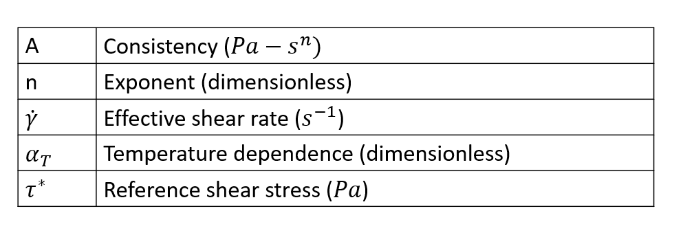 Exponent | Power law index, defines the dependency of viscosity on shear rate | None | Constant | Required | 0.66 |