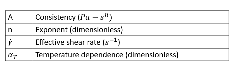 Consistency One of the parameters of the power law model. When n=1 it is the same as viscosisty. pa s^n Constant Required 1.0e+04