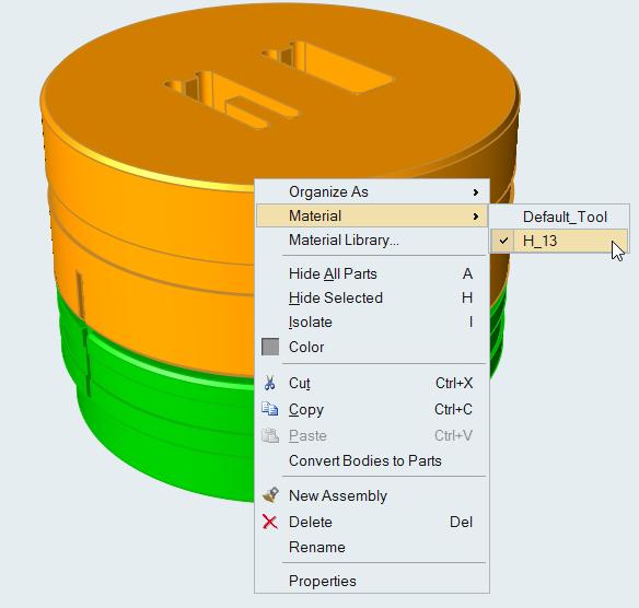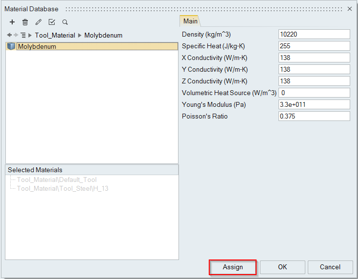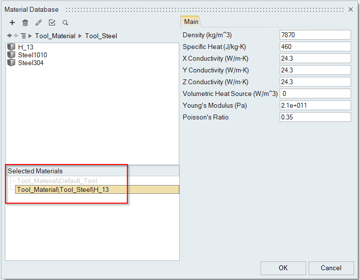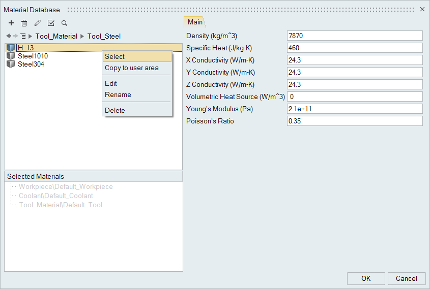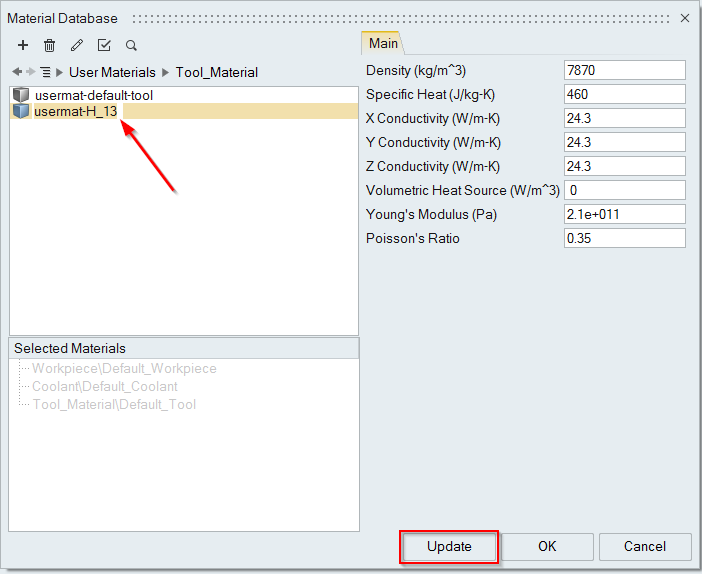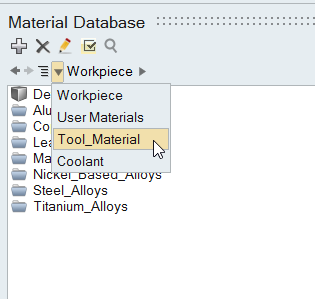 In the Material Database dialog, to the right of , click the triangle and select Tool_Material.