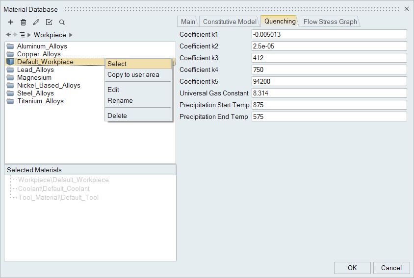 2. In the Material Database dialog, to the right of , click the triangle and select Workpiece.
