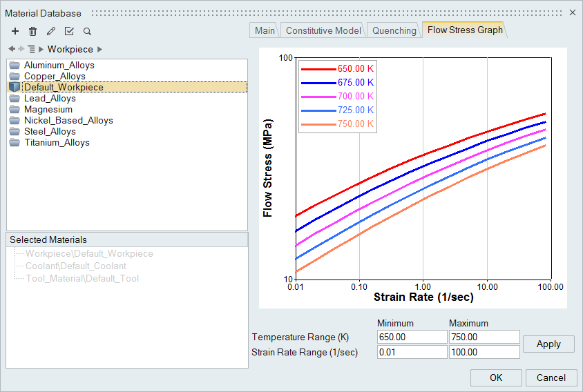 You can review properties of the material including the Flow Stress Graph which allows you to observe the flow stress of the material with respect to strain rate.